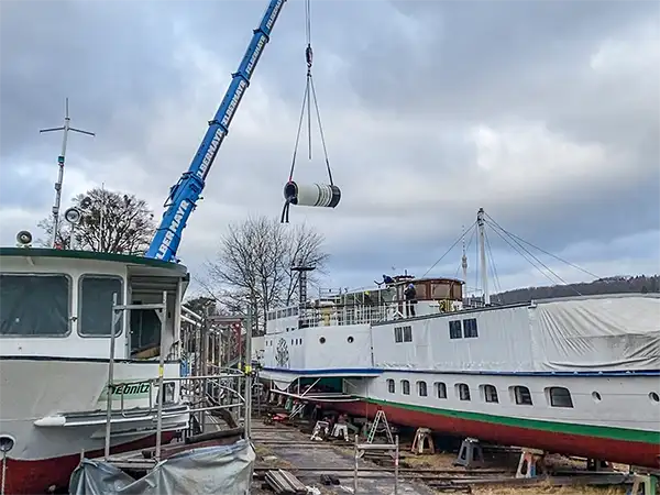 In der Schiffswerft Laubegast wurde am 20.12.2021 der defekte Dampfkessel aus dem Schiffsrumpf der "Leipzig" geborgen.