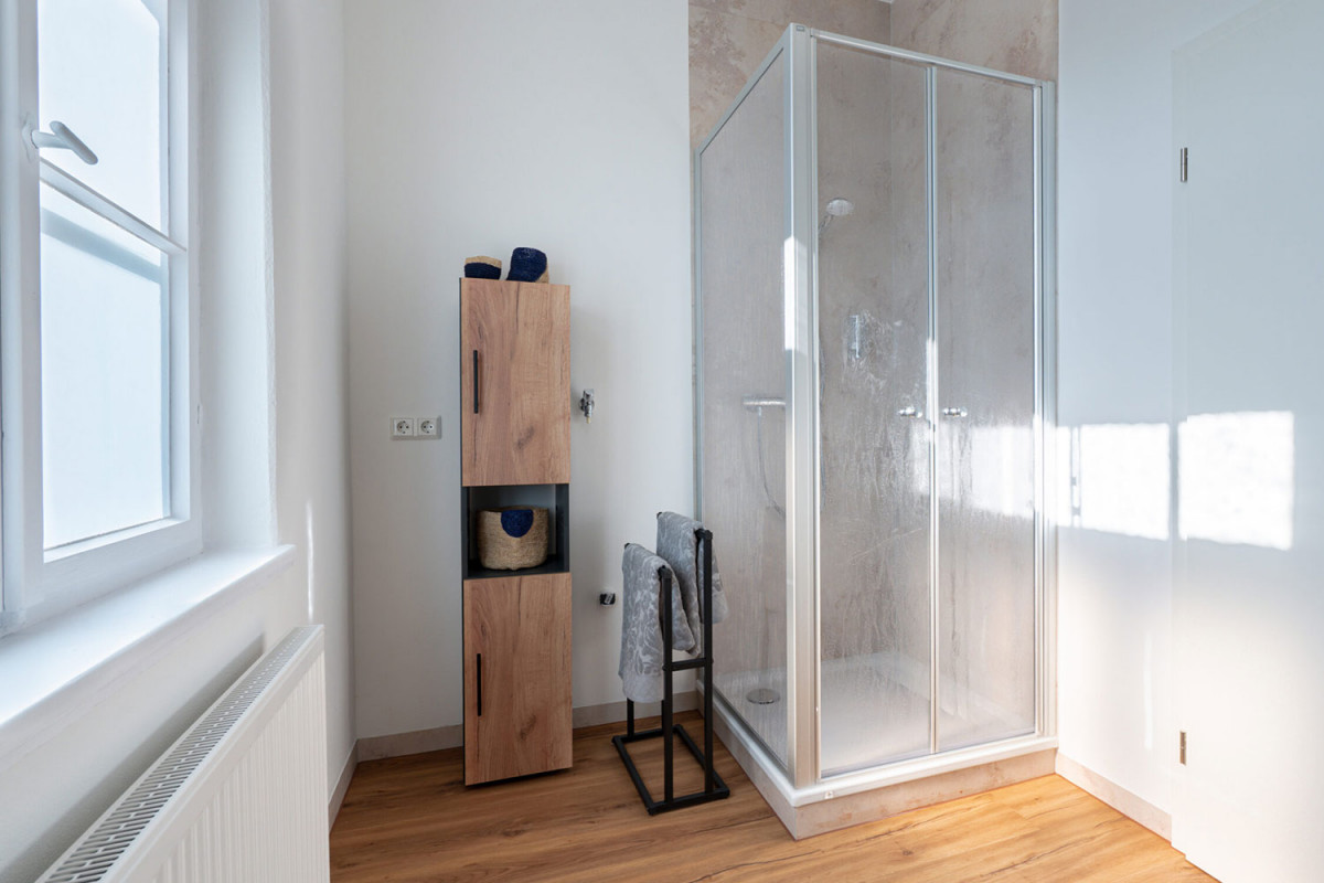 Damit ist unser Objekt auch gut für 6 Personen geeignet. Weil im Bad auch 2 Duschen und 2 WCs zur Verfügung stehen, ist unsere Fewo somit ideal für befreundete Paare oder große Familien geeignet. Die komplett eingerichtete Einbauküche hat ein Cerankochfeld mit 4 Kochstellen sowie einen Umluftherd. Ein Geschirrspüler rundet die Kücheneinrichtung ab.