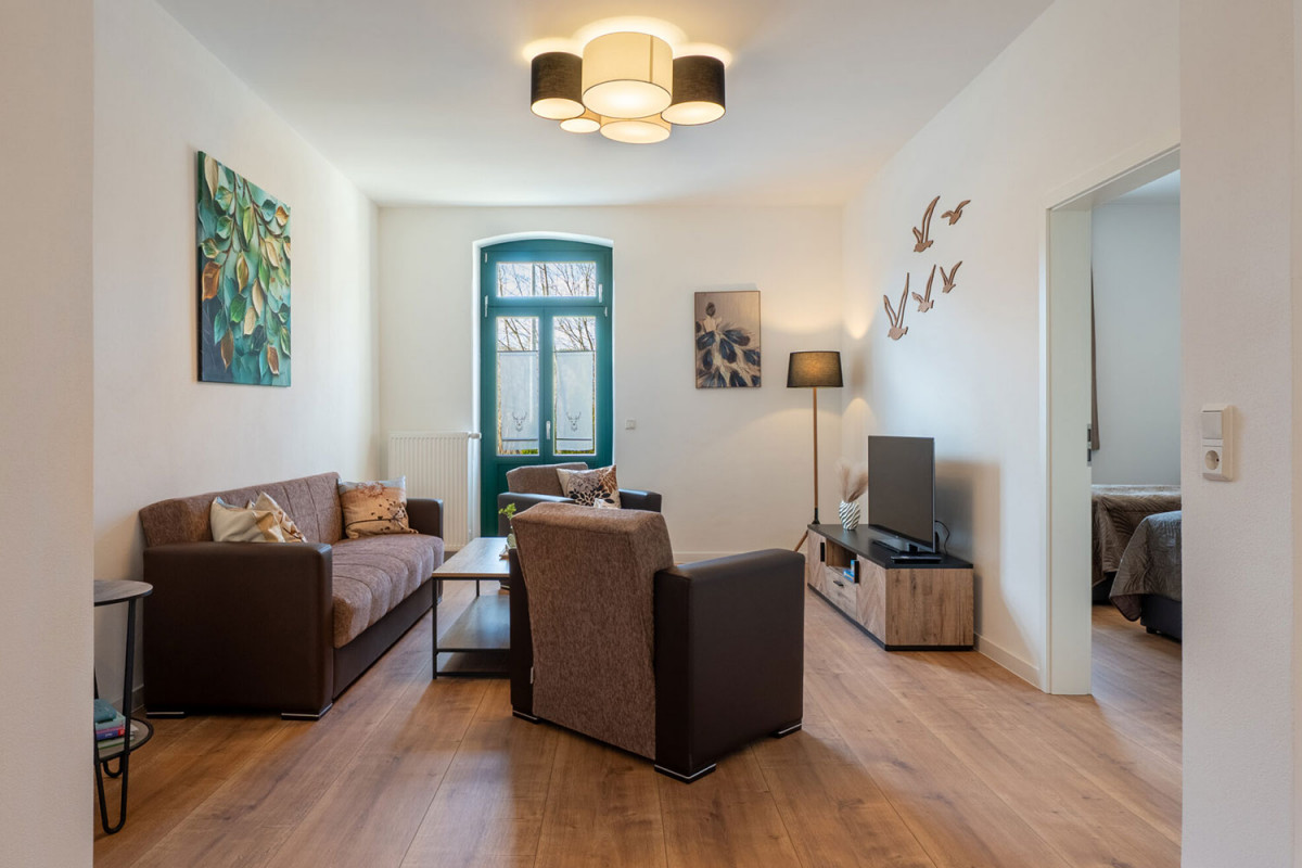 Unsere ca. 75 m2 große Ferienwohnung verfügt über 2 Schlafzimmer mit je einem Doppelbett für insgesamt 4 Personen. Im Wohnzimmer gibt es außer einer Ess-Ecke (Eckbank und großer Esstisch) einen Wohnbereich mit 2 Schlafsofas, die jeweils auf eine Breite von 1,40m ausgeklappt werden können, so dass problemlos noch 2 Schlafmöglichkeiten entstehen.