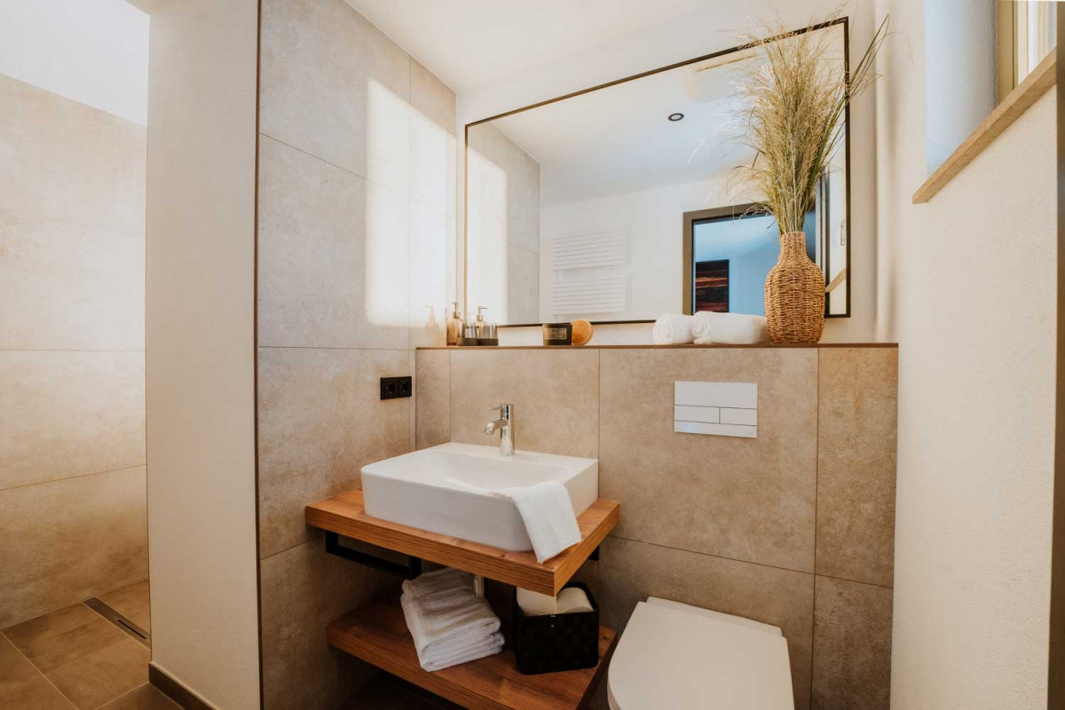 - beides mit Fußbodenheizung, Terrasse, Bad, Sauna mit Farblichttherapie, Garderobe, Waschmaschinenraum im Haupthaus