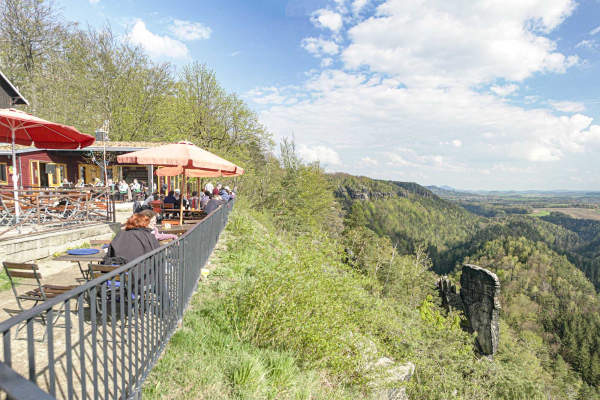 In Richtung Nordost dominiert das Basteimassiv mit den typisch hell gefärbten Abbruchflächen der früheren Sandsteinbrüche das Blickfeld. Man hat auch einen Blick zum Brand-Gebiet und der Waitzdorfer Höhe. Richtung Osten befindet sich im Vordergrund das Dorf Weißig.