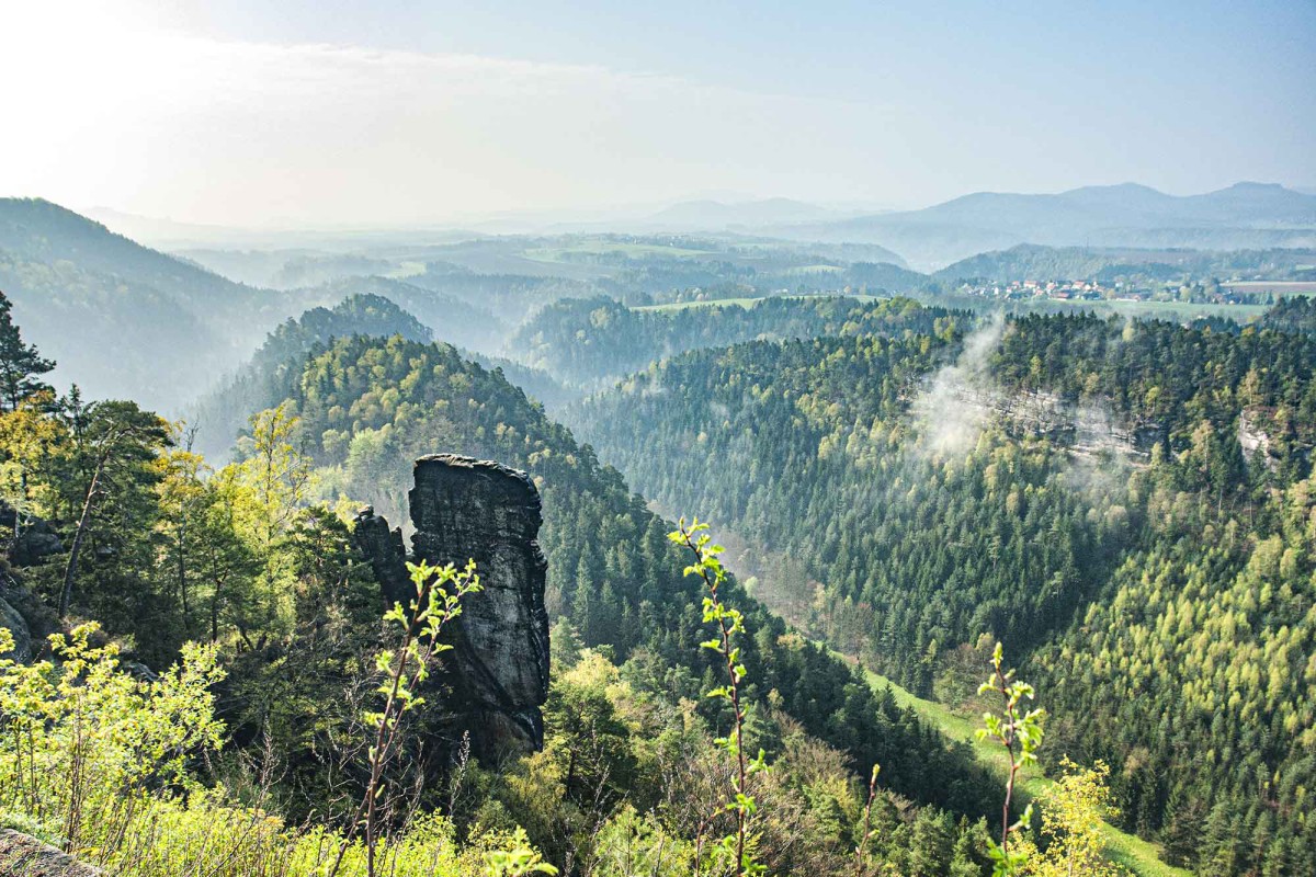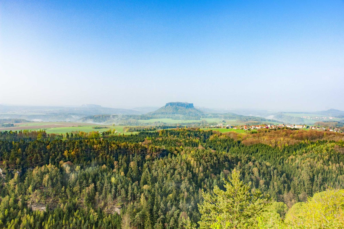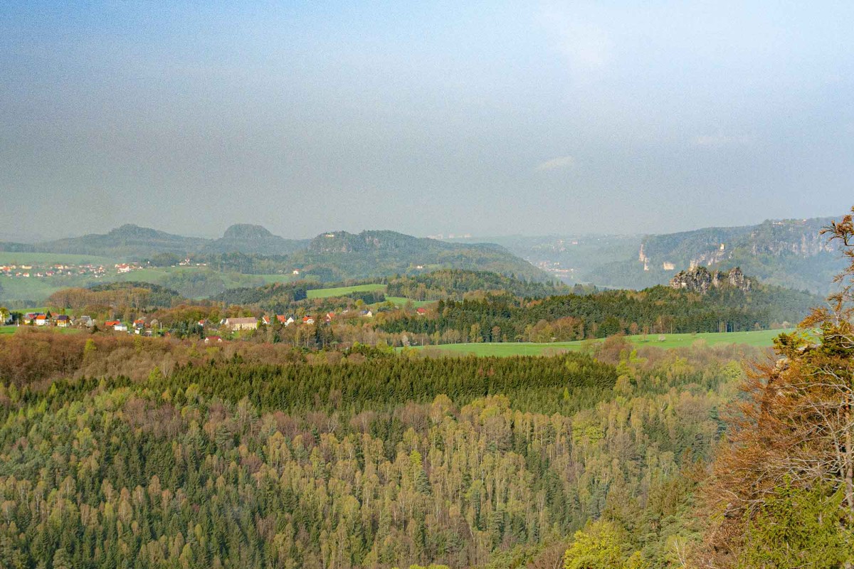 Am Horizont erkennt man die Berge und Höhen der Hinteren Sächsischen Schweiz (u. a. Schrammsteine, Zirkelstein, Großer Winterberg) und der Böhmischen Schweiz mit dem markanten Růžovský vrch (Rosenberg).