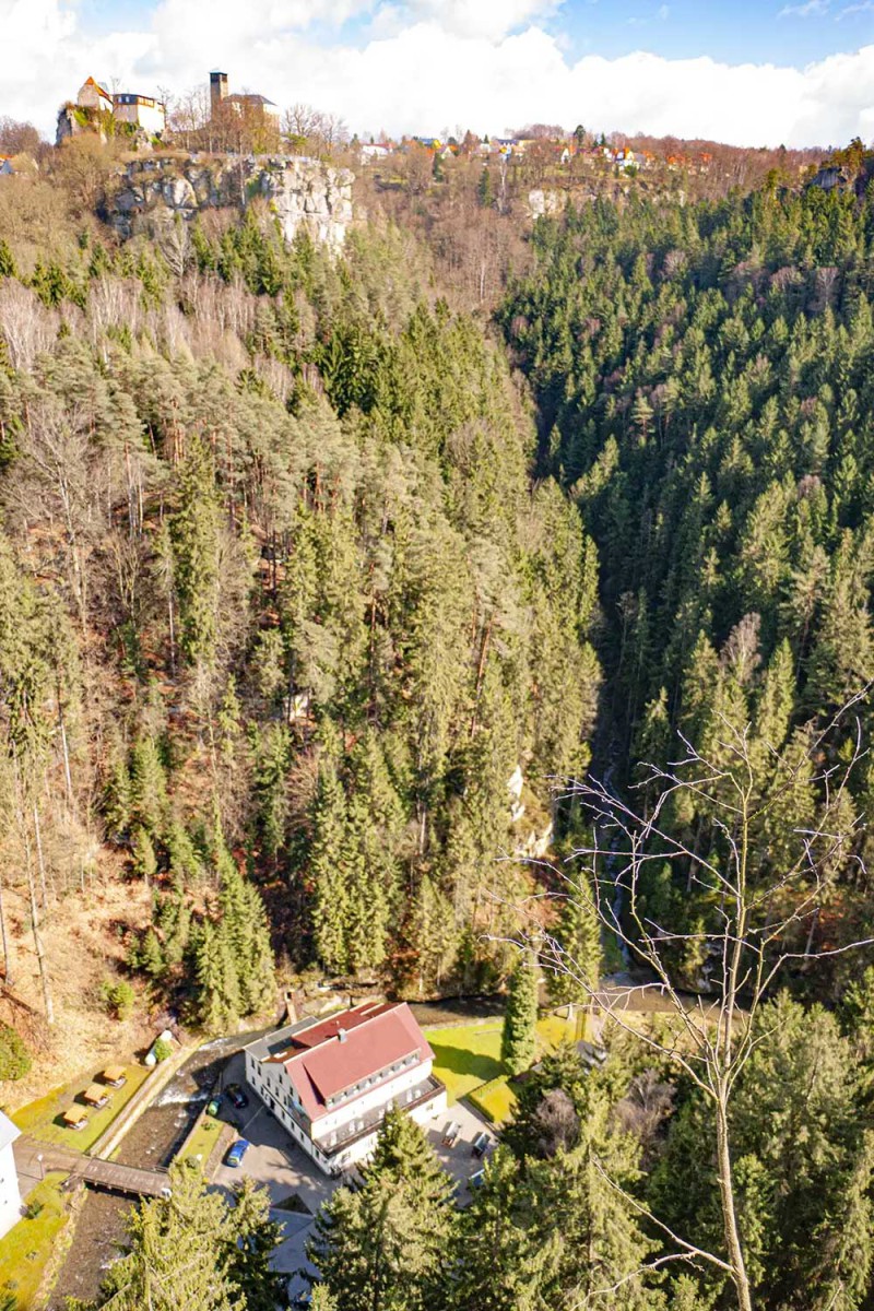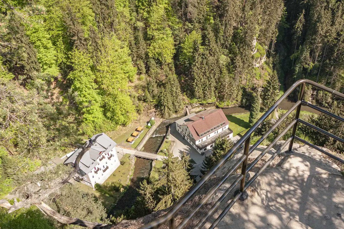Von Hinterhermsdorf führt ein gut beschilderter Wanderweg bis zur Bootsstation der Oberen Schleuse. Auch hier gibt es an der Rindenhütte ein kleines gastronomisches Angebot bevor man sich auf die "gefährliche" Bootsfahrt einlässt. Die Kirnitzsch macht hier einen sehr friedlichen Eindruck und man kann sich schwer vorstellen, dass im August 2010 nach schweren Regenfällen an der Bootsstation das Wasser bis an die Fenster stand. Während dieser Flut verwüstete das Treibholz flussabwärts zahlreiche Mühlen und auch die Kirnitzschtalstraße.