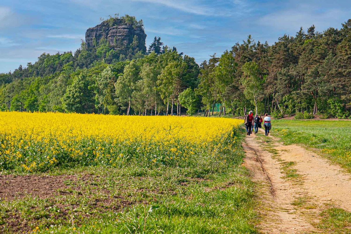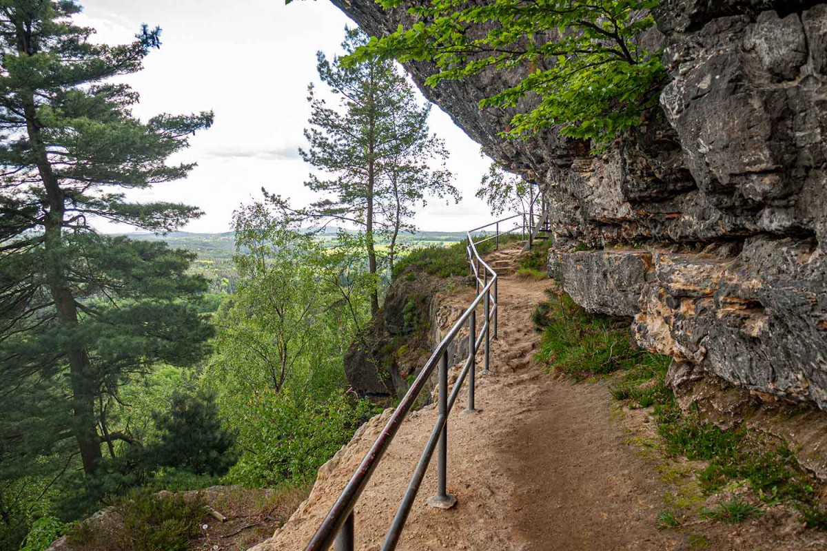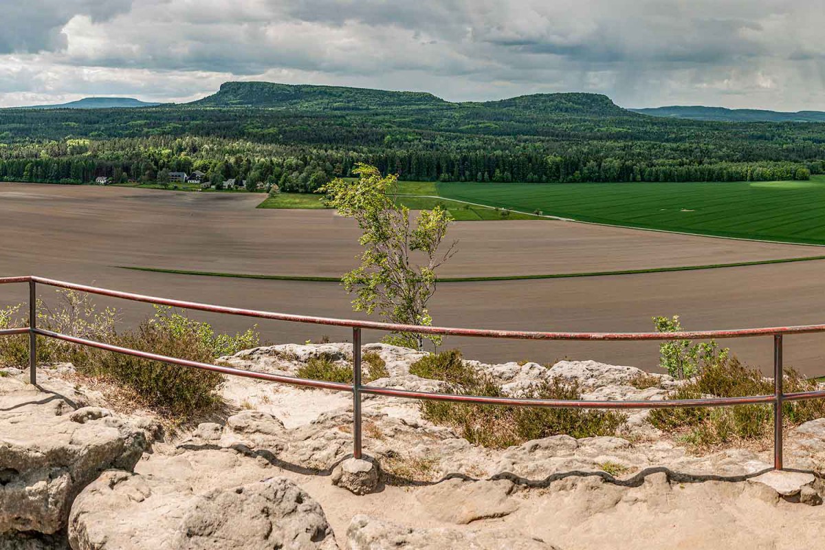 In Richtung Osten, auf der anderen Elbseite sieht man den Einschnitt des Kamnitztales. Der Ort Herrnskretschen (Hrensko)ist an der Kamnitzmündung nur zu erahnen. Weiter hinten sieht man den kegelförmigen Rosenberg (Růžovský vrch) und noch weiter, am Horizont den Kaltenberg (Studenec) und das Lausitzer Gebirge. Nach Süden dominiert das tief eingeschnittene Elbtal den Blick. Im Südwesten folgt am Horizont der Hohe Schneeberg und etwas näher die beiden Zschirnsteine. Im Westen sieht man die linkselbischen Tafelberge. Am klarsten ist der Lilienstein zu erkennen. Von Norden bis Nordosten zieht sich die Schrammsteinkette und schließlich der Große Winterberg.