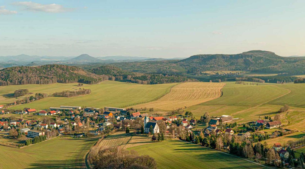 Weiter im Süden (im Bild nach rechts) erkennt man die hellen Felsen der Schrammsteinkette. Hier sind noch die Spuren eines weit über 100 Jahre zurückliegenden Sandsteinabbau (in Postelwitz) erkennbar. Die Schrammsteine gehen direkt in den Großen Winterberg über. Im Vordergrund liegt der kleine Urlaubsort Papstdorf mit seiner spätbarocken Kirche vor uns.
