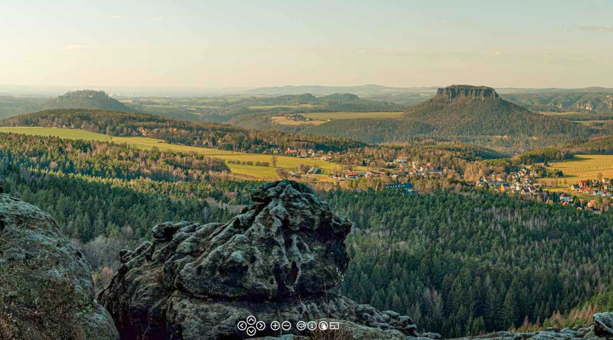 Im Nordwesten befindet sich die Festung Königstein. Rechts vom Königsteinerahnt man das Elbtal und sieht auf der anderen Elbseite den Lilienstein. Rechts hinter dem Lilienstein erstreckt sich am Horizont das Basteimassiv und weiter östlich das Brandmassiv. Nun sieht man im Vordergrund den Kletterfelsen "Große Hunskirche", die häufig bis in die Abenddämmerung von Kletterern bestiegen wird.