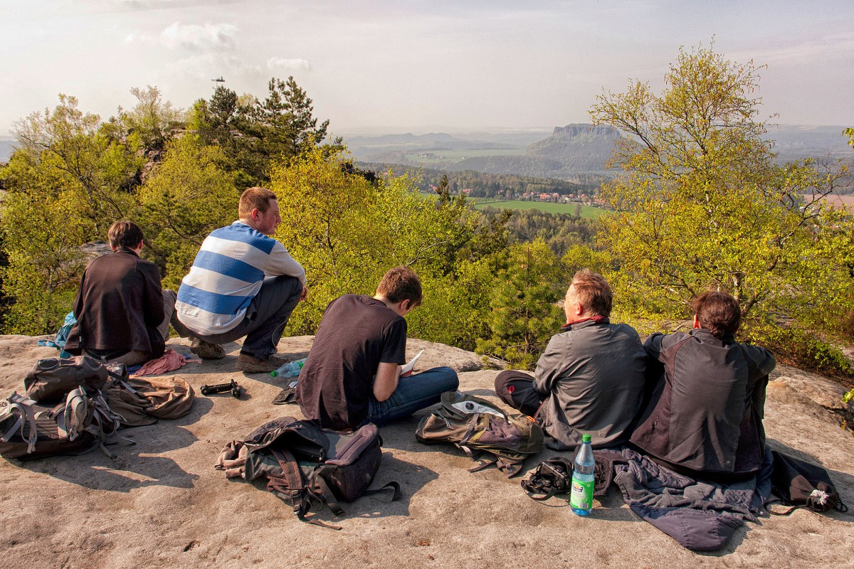 Im Nordwesten befindet sich die Festung Königstein. Rechts vom Königsteinerahnt man das Elbtal und sieht auf der anderen Elbseite den Lilienstein. Rechts hinter dem Lilienstein erstreckt sich am Horizont das Basteimassiv und weiter östlich das Brandmassiv. Nun sieht man im Vordergrund den Kletterfelsen "Große Hunskirche", die häufig bis in die Abenddämmerung von Kletterern bestiegen wird.