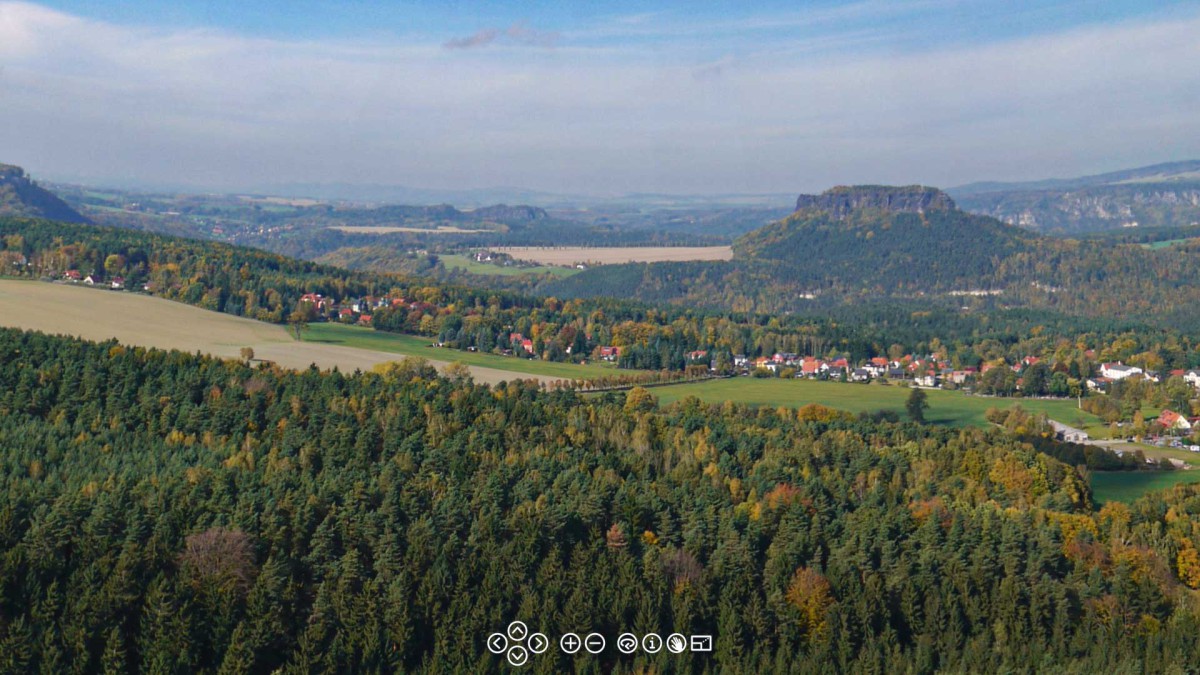 Das Panoramafoto zeigt von links beginnend die Festung Königstein. Zu unseren Füßen liegt die Gemeinde Pfaffendorf (ein Ortsteil von Königstein). Danach kommt der Lilienstein und ganz rechts der Gohrischstein. Den Fotostandort erreicht man nach dem steilen Anstieg auf dem Plateau in Richtung Nordost.