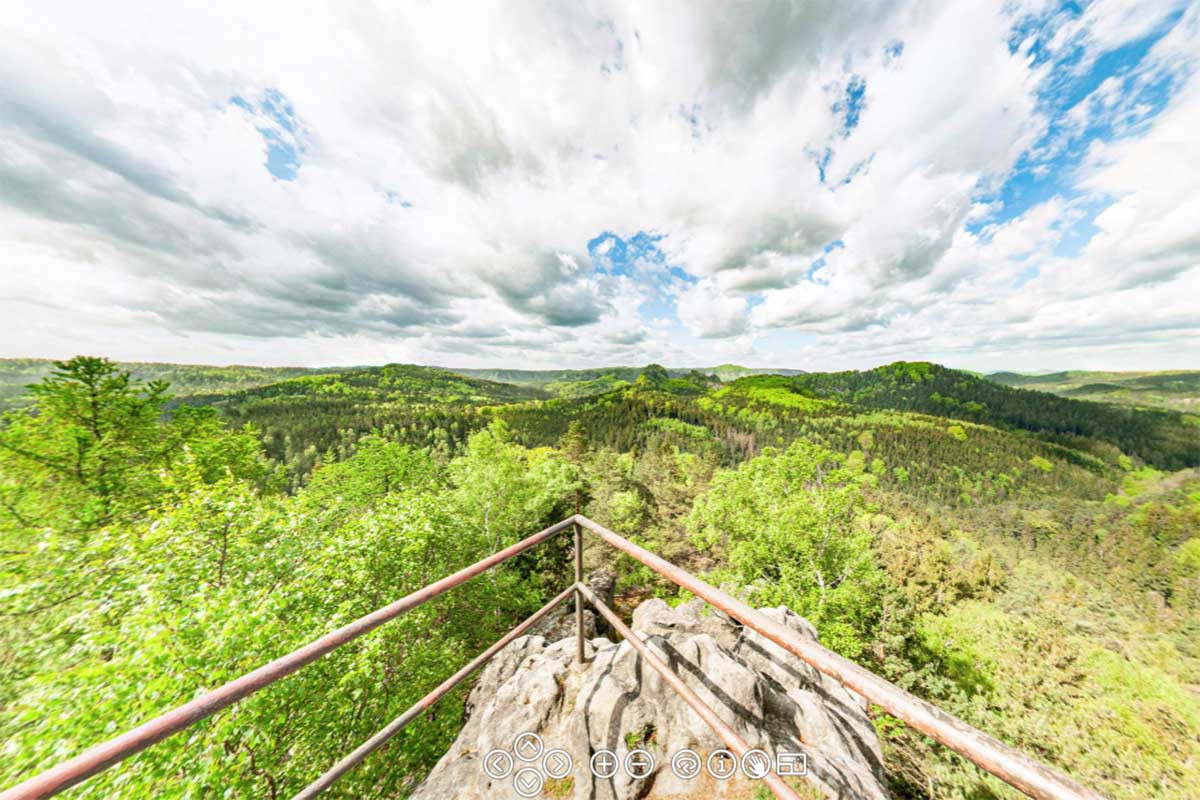 In Richtung Osten, auf der anderen Elbseite sieht man den Einschnitt des Kamnitztales. Der Ort Herrnskretschen (Hrensko)ist an der Kamnitzmündung nur zu erahnen. Weiter hinten sieht man den kegelförmigen Rosenberg (Růžovský vrch) und noch weiter, am Horizont den Kaltenberg (Studenec) und das Lausitzer Gebirge. Nach Süden dominiert das tief eingeschnittene Elbtal den Blick. Im Südwesten folgt am Horizont der Hohe Schneeberg und etwas näher die beiden Zschirnsteine. Im Westen sieht man die linkselbischen Tafelberge. Am klarsten ist der Lilienstein zu erkennen. Von Norden bis Nordosten zieht sich die Schrammsteinkette und schließlich der Große Winterberg.