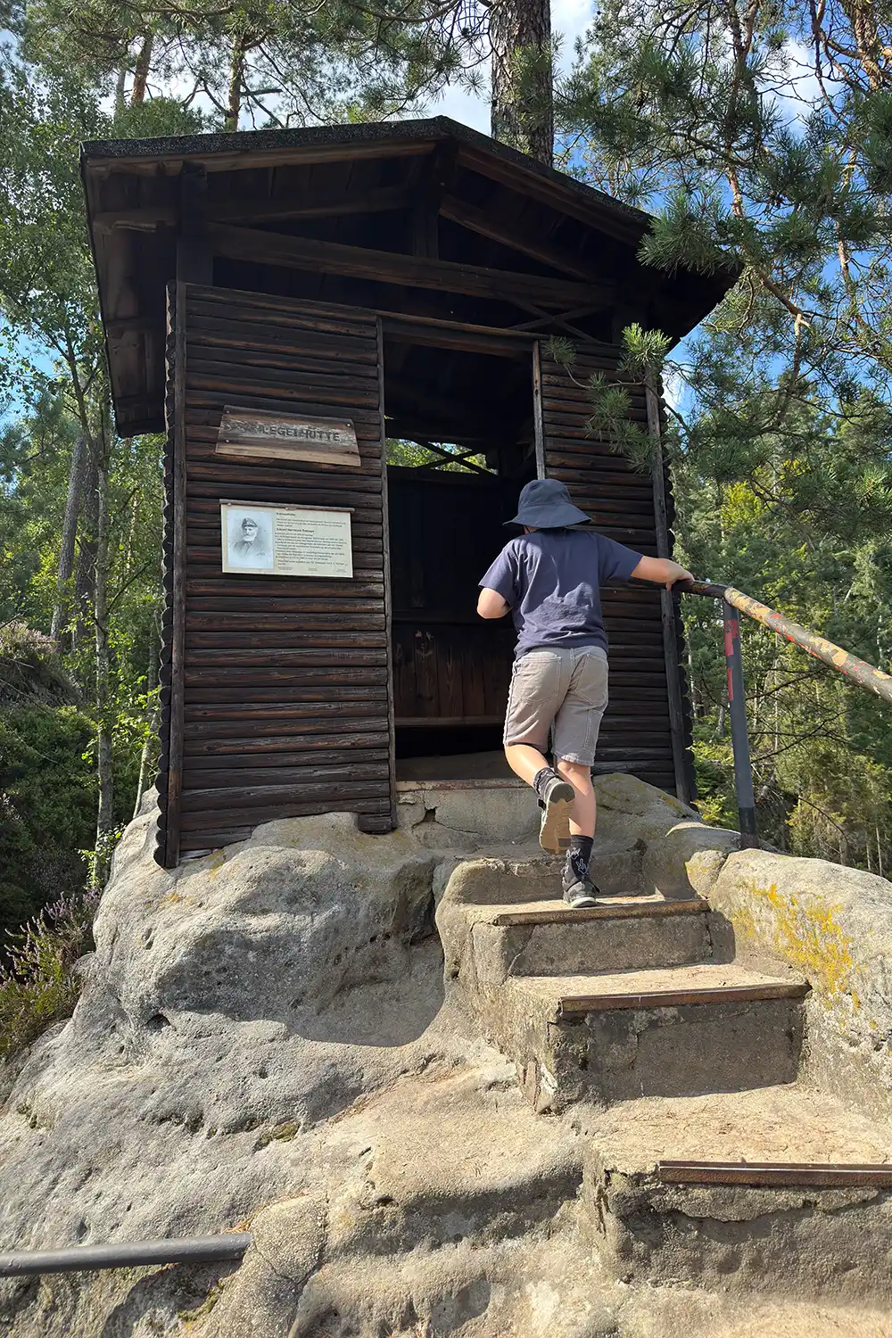 Von hier führt ein gut beschilderter Wanderweg bis zur Bootsstation der Oberen Schleuse. Auch hier gibt es an der Rindenhütte ein kleines gastronomisches Angebot bevor man sich auf die "gefährliche" Bootsfahrt einlässt.