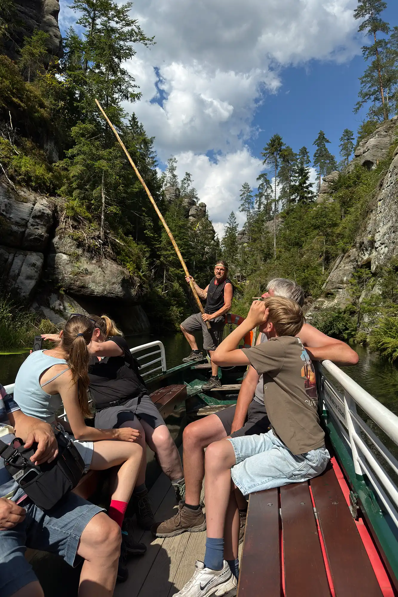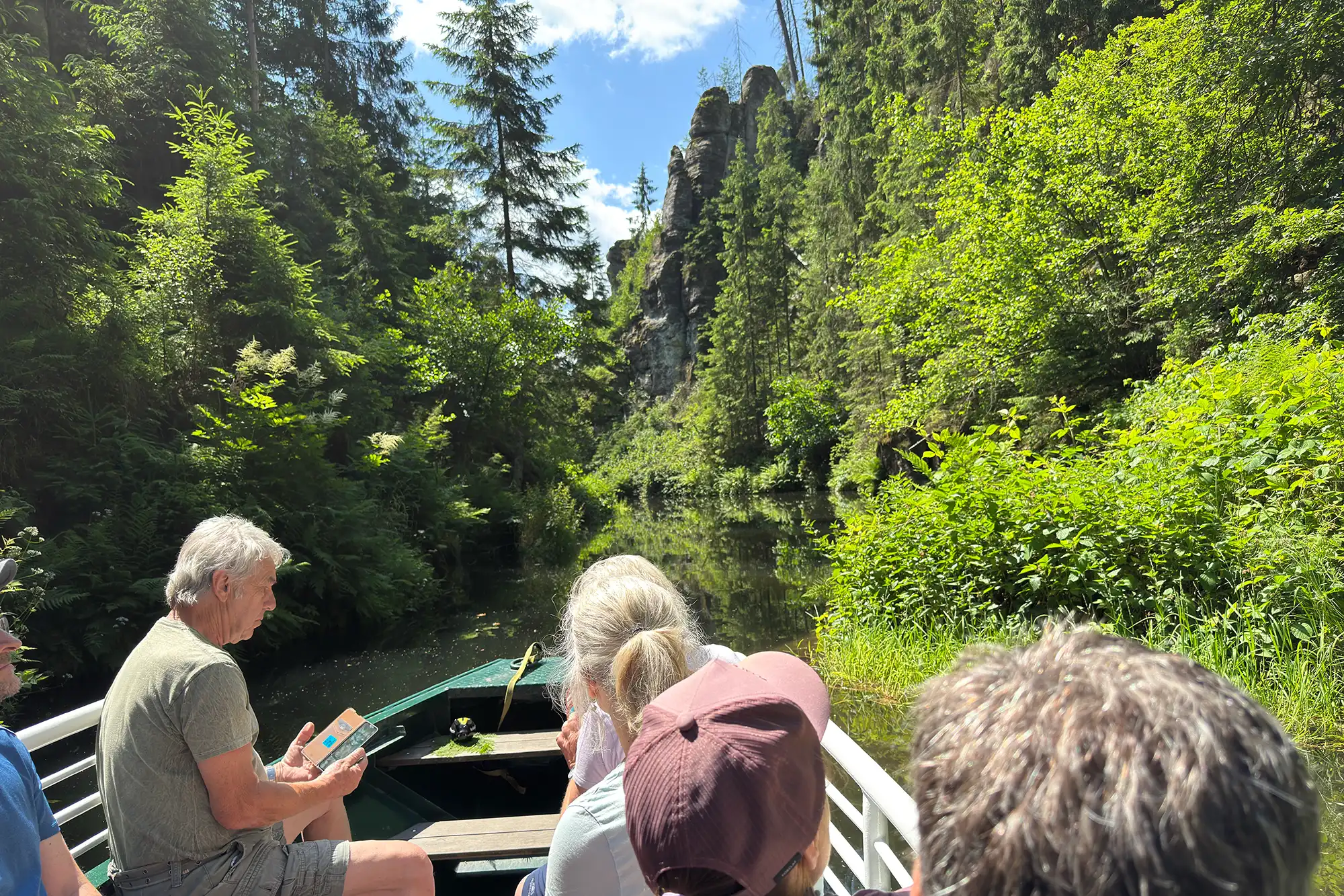 Die Kahnfart ist stets sehr unterhaltsam. Wenn man das Glück hat mit dem Mundharmonika spielenden Fährmann zu reisen, wird die Fahrt besonders romantisch und aufregend. Viele lustige Einlagen und Episoden machen diese Fahrt auf dem Grenzflüsschen zwischen Böhmen und Sachsen zu einem besonderen Ereignis. Übrigens ist die Grenze zwischen Sachsen und Böhmen die älteste durchgängige Grenze Europas, da sie seit 1459 fast unverändert geblieben ist.