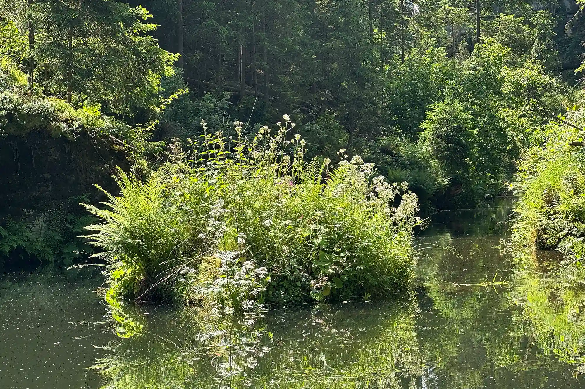 Die Kirnitzsch macht hier einen sehr friedlichen Eindruck und man kann sich schwer vorstellen, dass im August 2010 nach schweren Regenfällen an der Bootsstation das Wasser bis an die Fenster gestanden hat. Während dieser Flut verwüstete das Treibholz flussabwärts zahlreiche Mühlen und auch die Kirnitzschtalstraße.